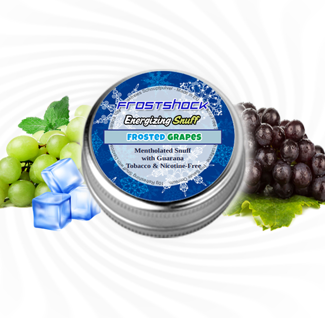 Frosted Grapes conbines red and green grapes with menthol and guarana. Tobacco and nicotine free nasal snuff. 10g tin.