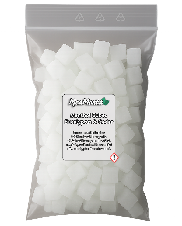 Mini-Saunawürfel aus reinen Mentholkristallen, verfeinert mit ätherischen Ölen aus Eukalyptus und Zedernholz
